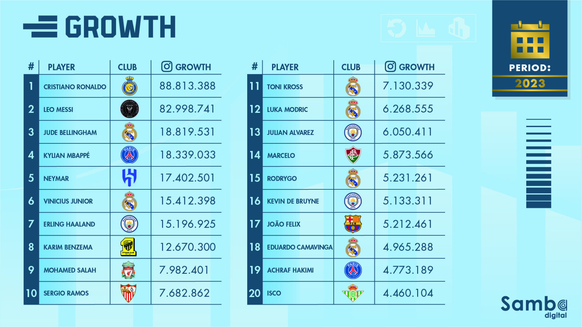 Sergio Ramos, who returned to Sevilla after a season at PSG, is in 10th position, with 7.68 million new followers. Marcelo, who returned to Fluminense to win the Copa Libertadores for the first time, ends 2023 in 14th, with 5.87 million. Isco, from Betis-SPA, in turn, gained 4.46 million new users, and ranks in 20th position.