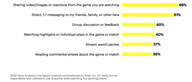 But how do people use Snapchat when it comes to sport? In a survey commissioned by Snapchat for the 2020 Super Bowl it found that it was mostly used to share videos and images from the game and direct messaging friends and family.