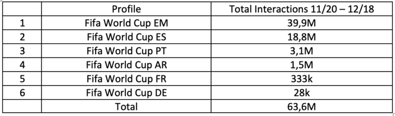 While FIFA’s profiles totaled 63.6 million interactions during the 28 days of competition, the official accounts of the 30 national teams – Iran and Tunisia, just like on Instagram, did not post even once on Twitter – accumulated over 25.5 million interactions.