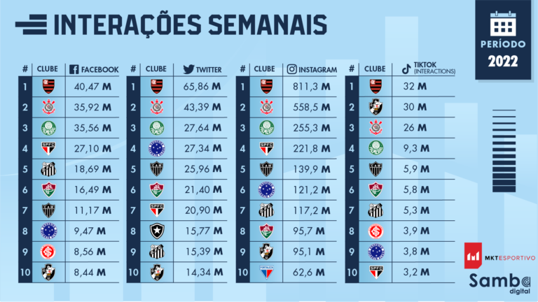 With the exception of Facebook – which had a reduction in the number of followers compared to 2021, despite the increase in the number of interactions, all other social media networks grew. TikTok was the only social media platform in which Flamengo did not dominate, despite having the highest number of interactions: 32.1 million interactions against 30.7 million for Vasco, who were second in the category.