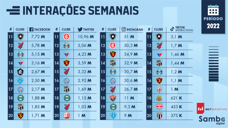 In all, the 20 Brazilian clubs totaled 3.59 billion interactions. In addition, performance on all four social media platforms increased performance compared to 2021. Instagram is the main driver of these, with 79.78% of the total interactions in Brazilian football. Too, despite the power of Instagram, performances on TikTok also draw attention.