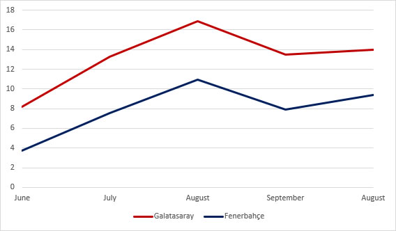 Fenerbahçe, in turn, went from 7.9 million interactions in September to 9.36 million in October – an increase of 15.6%.