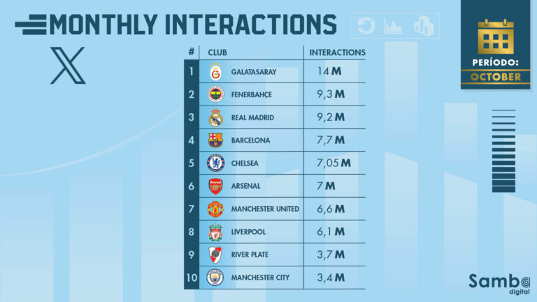 Leading these rankings is nothing new for Galatasaray. In September, the club – which accumulated 13.6 million interactions – was also the one with the best performance in this regard. In October, growth was just over 3%, compared to the previous month.
