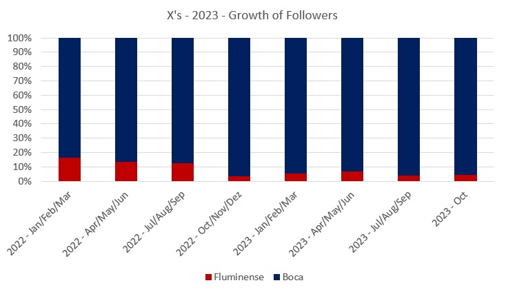 Back to the comparison with Fluminense: the difference between the two clubs increased significantly in 2023, as Boca Juniors added more than 738,000 new followers, while Fluminense gained just over 43,000 until October 29.