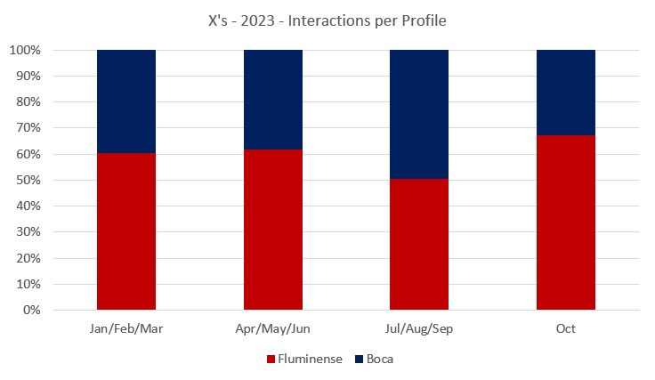 But, here, the unlikely happened: Fluminense, with 23.2 million interactions, has an advantage over Boca Juniors and its 18.2M interactions throughout 2023.