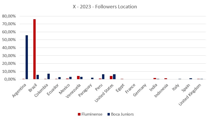Of the 10 cities with the most Xeneize followers, 4 are Argentine; in the case of Fluminense’s page, on the other hand, 9 are Brazilian.