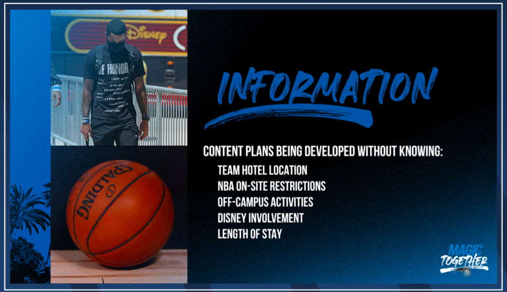 But they also needed information from the league to be able to plan what the content was going to be, and how they could best achieve what they wanted. They were developing plans without much of the basic information we take for granted in our roles, for example where the players will be staying or how long they will be there for. Could they capture content with players on their way to the bubble? What tools will they have to be able to do the best job they can?