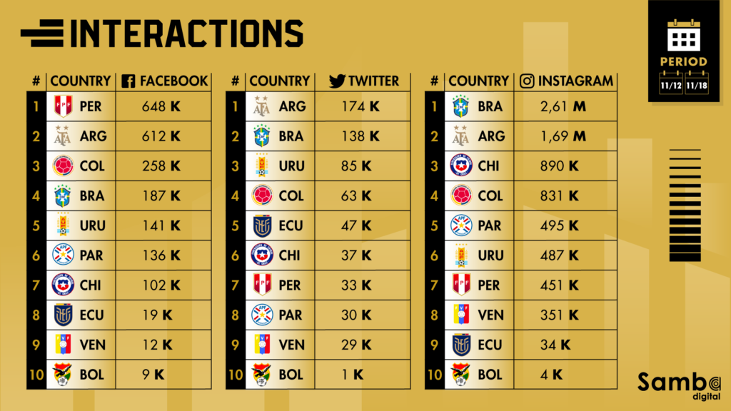 5. With approximately 450K Instagram interactions, Peru had the highest rate of engagement by followers among the South American teams: 3.82%. For comparison, Argentina had a rate of 2.43% and Brazil of 0.83%. In Rounds 1 and 2, Argentina had obtained the best rate with 3.54%.