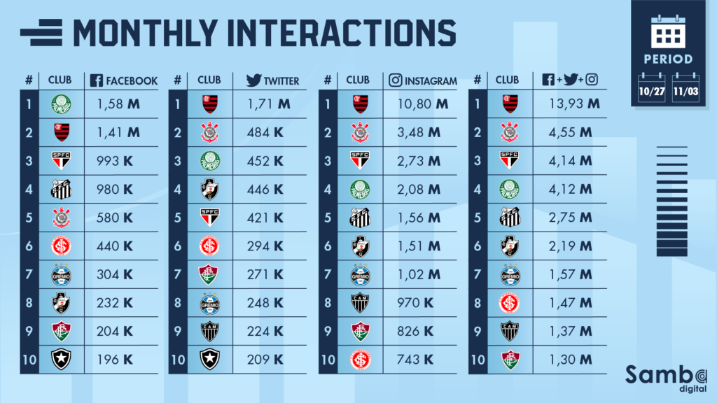 - For the first time since the Ranking was created, Flamengo was defeated. Palmeiras is the #1 in Facebook Interactions between October, 27 – November, 3