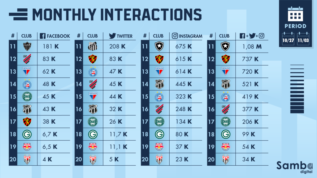 - After a week that was State Champions, Fortaleza’s numbers plummeted. Last ranking, the club had more than 2 millions interactions and this week the club had 35% of that interactions.