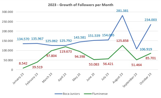 This imbalance has been growing throughout the 2023 season, as Boca Juniors registered an increase of 1.6 million new followers, while Fluminense is close to half of that: 800,000 new followers.