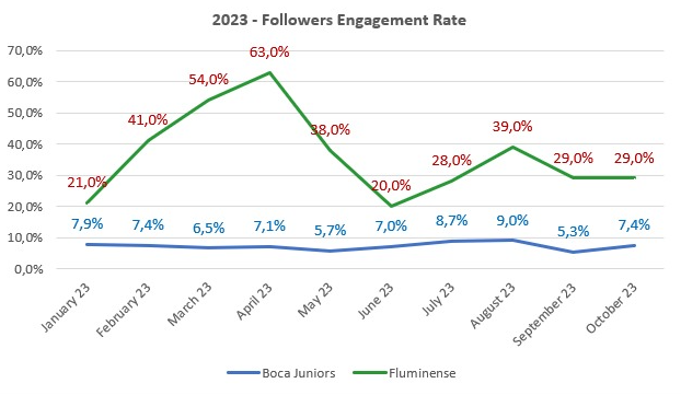 Fluminense’s high engagement rates indicate the excellent quality of the content produced by the Brazilian club. It is necessary to consider, however, that the follower base 4.95 times smaller than that of Boca Juniors makes it a little less complex to obtain a higher engagement rate for Fluminense’s digital team.