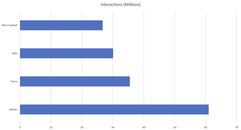 With six million interactions, Messi’s post helps Adidas’ football page lead the digital race among sportswear companies.