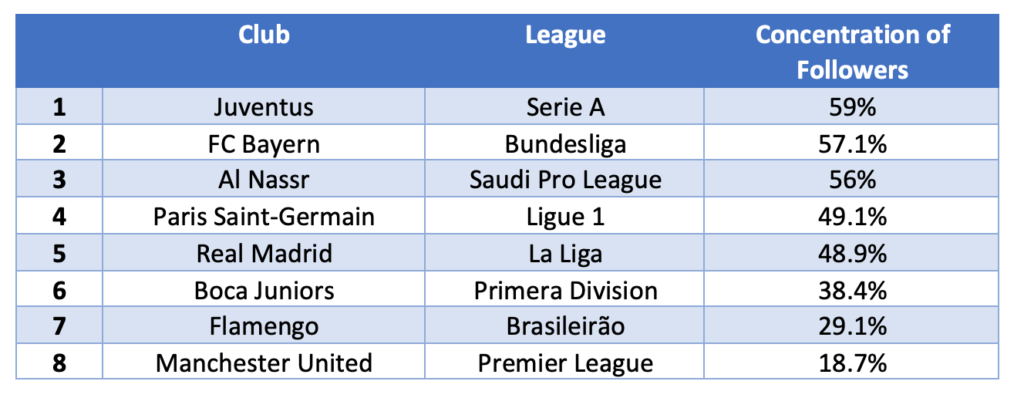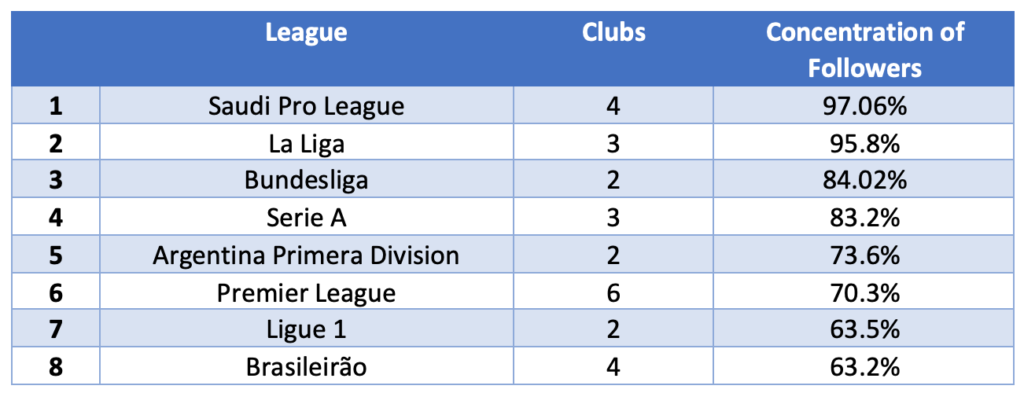 The Saudi scenario also shows a high concentration rate in the club that has the most followers in relation to other competitors in its own league.