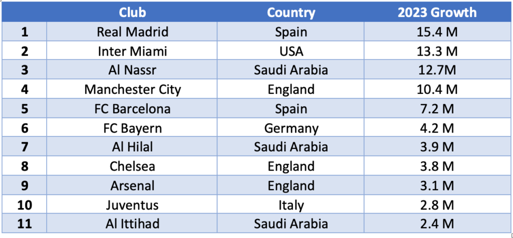 Among the top 11 clubs, three are Saudi. Alongside England, it is the country that had the highest number of clubs among those that most expanded their digital domain on Instagram – the social media platform that holds the largest market share in digital consumption.
