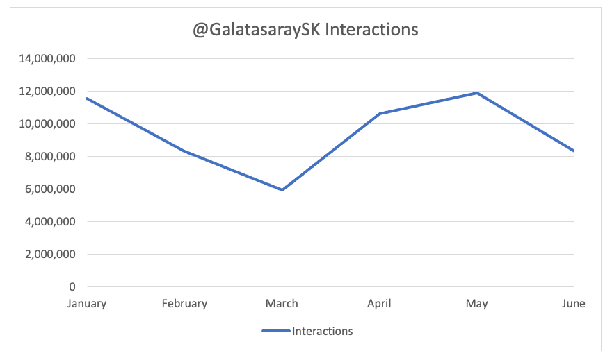 The performance of Galatasaray’s interactions throughout the first half of 2023 did not change significantly. The monthly analysis reveals that the interactions between January and May have similar performances, which shows a linearity in the content format: