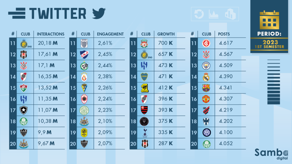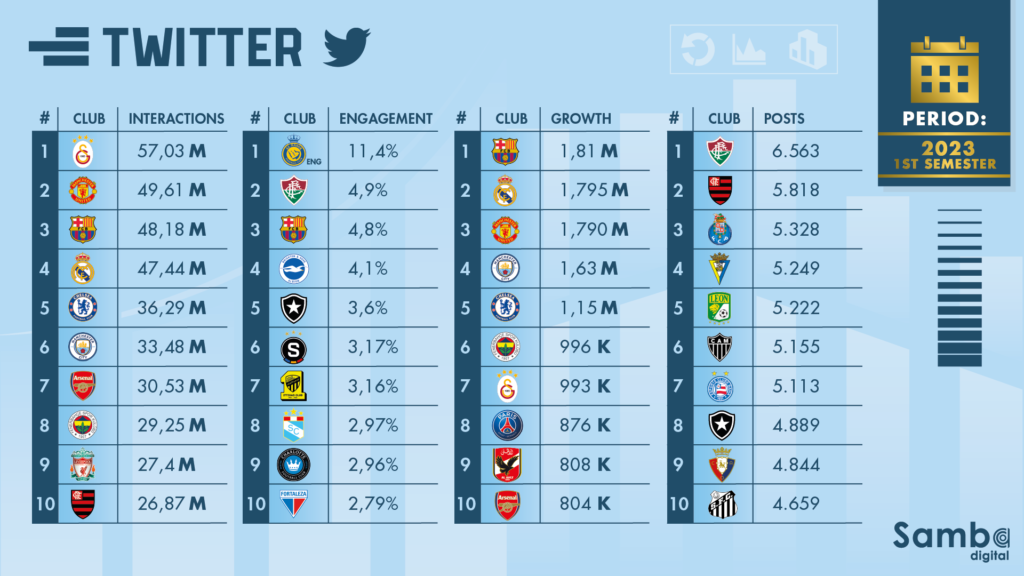 We are more than used to seeing Real Madrid, Barcelona or an English club having the most interactions on Twitter, but the first half of 2023 brought us a surprise: Galatasaray. With just over 57 million interactions, the Turkish club ranks first in interactions over the first six months of the year, ahead of the usual English and Spanish giants.