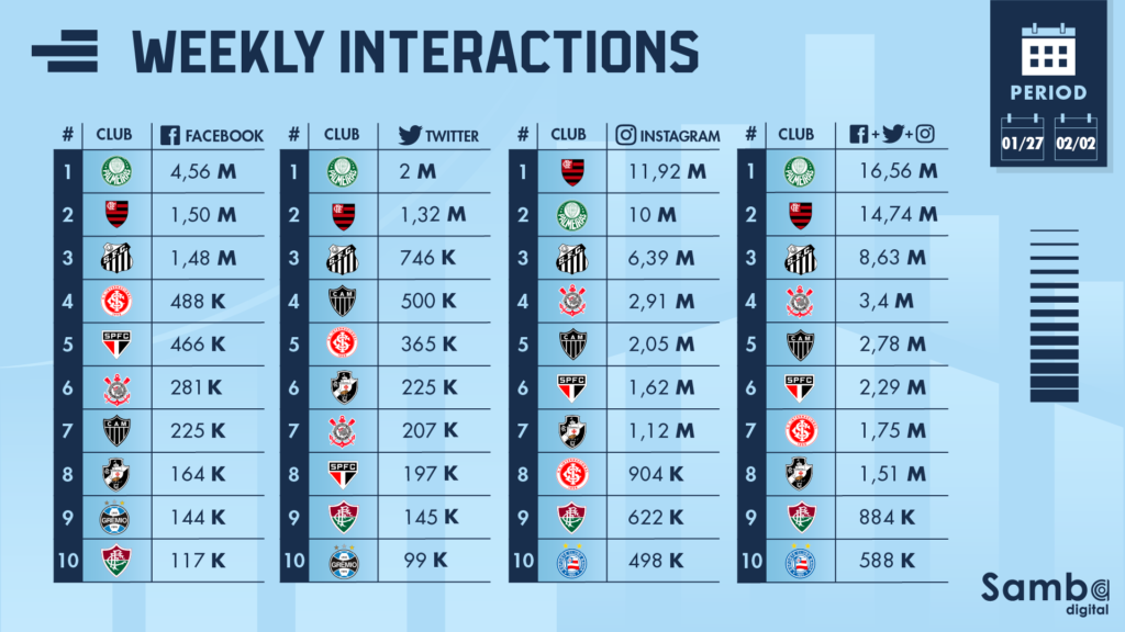 On Saturday, the Facebook highlight included Palmeiras, the leader in Facebook interactions in our social media table. Palmeiras managed 1.71 million interactions on 28 January, followed by 1.65 million interactions on the following day.