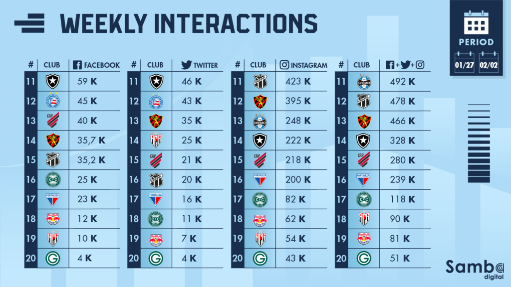 Fifteen clubs are losing the fight for interactions, with just five clubs seeing an improvement in interactions over the past week. The Palmeiras, star club of the week and their opponent, Flamengo, were two of the successes. Followed by Santos, Atletico-MG and Bahia.