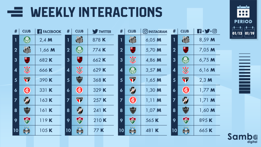 The performance of Santos didn’t just end there! They did the impossible feat by defeating Flamengo on Instagram. Santos achieved 6.05 million interactions this week, beating the Rio team by more than 345,000 interactions. Santos also set a new record on Facebook this week, with an 87% rise in interactions compared to last week.
