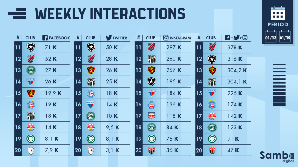 Nine of the twenty teams analysed this week have encountered a decline in their social media interactions over the past seven days, casting a negative light on the performance of the North-Eastern Teams. For instance, Ceará and Sport experienced a decline of 64%, Bahia with minus 50%, Vasco and Fortaleza followed by a decline of 47%, Fluminense -45%, São Paulo and Botafogo -31% and finally Athletico PR with a slight decline of 25%.