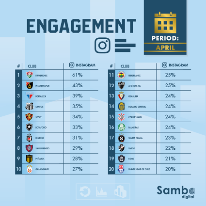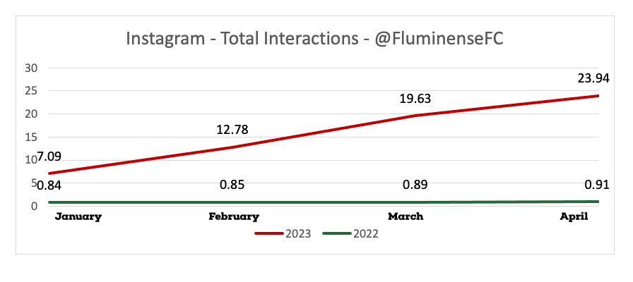 In addition to this 61% engagement rate, Fluminense also stood out as the 20th-ranked club in the world in terms of number of interactions, with a total of 23.8 million interactions during the month of April.