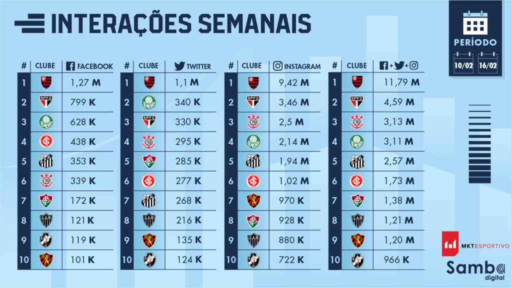 It’s no surprise that the peak of the week on Instagram is Flamengo. Their major victory against Corinthians on Sunday made the Rubro-Negro achieve an impressive 4.66 million interactions. This result alone, with a gap of 1 million interactions, beats São Paulo.