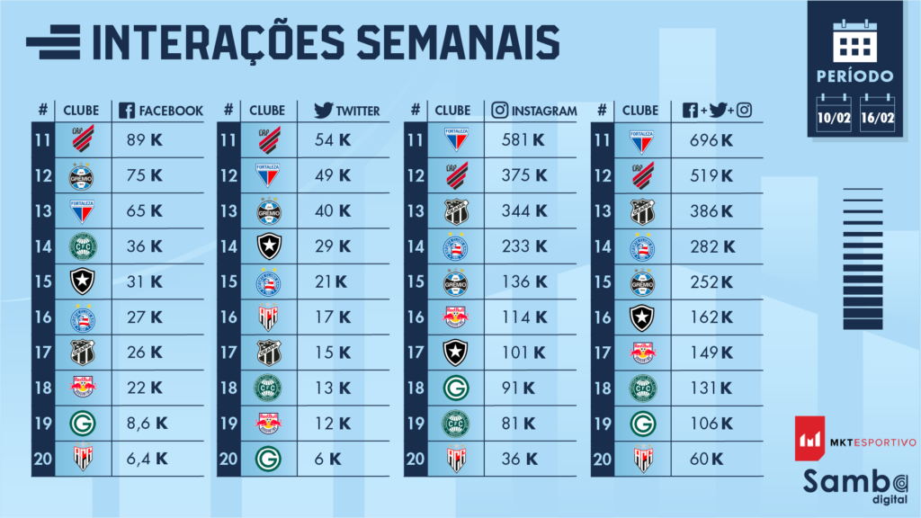 We have a couple of surprises this week in our weekly look at the performances of the Campeonato Brasileiro Série A and their clubs on the major social media platforms: Facebook, Twitter, and Instagram.