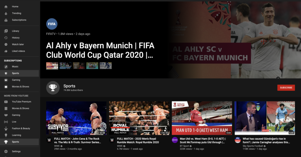 Youtube has taken these figures and ran with them as they developed YouTube.com/Sports. This new location devoted to all sporting activities helps users to find all the content they want. When entering the section, we are engulfed in fantastic clips and highlights from everywhere in the world. We can find live broadcasts or panels, including interviews with the greatest athletes, as well as material from popular sport-focused YouTube channels.
