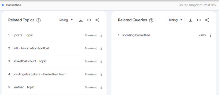 An example of trending topics in the UK based on the search term ‘basketball.’ You can be more specific with your searches, but this is an example of how Trends can help you discover relevant sub topics in certain regions—this is great if you’re looking to localize your sports marketing content.