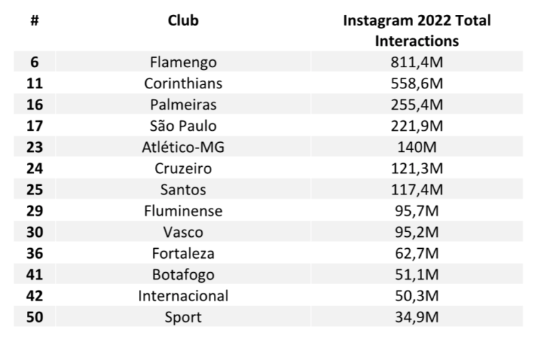 Instagram represents 80% of total interactions on the main social media platforms of Brazilian football clubs. With abundant content production, clubs in Brazil are the ones that stand out the most among the 50 that had the most interactions in 2022. Overall, 13 Brazilian clubs appear on the list of the global Top 50 in this regard: