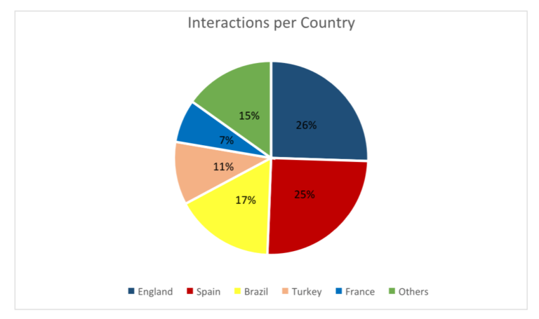 Together, Spain and England also feature 13 clubs on the list, with 50.62% of the total interactions, while the 13 Brazilian clubs, together, represent just 16.55%.