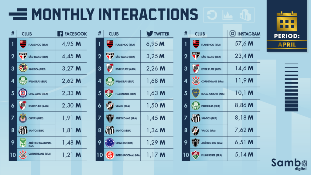 Welcome to our LATAM club rankings, where we rank clubs from Brazil, Mexico, Argentina, Uruguay, Chile, and Columbia on a monthly basis. We saw some impressive results from their club’s performances across the three major social media platforms in April, with Flamengo topping the leaderboards on Facebook, Twitter, and Instagram.