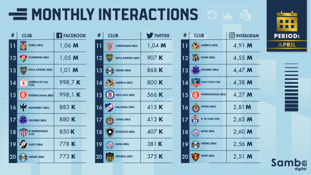 There is, however, some light at the end of the tunnel: Boca Juniors hit a new high of just over 150 thousand interactions on Facebook, surpassing 1 million. Growth was also slow on Twitter, with just 53,000 interactions and only 10,000 more on Instagram.