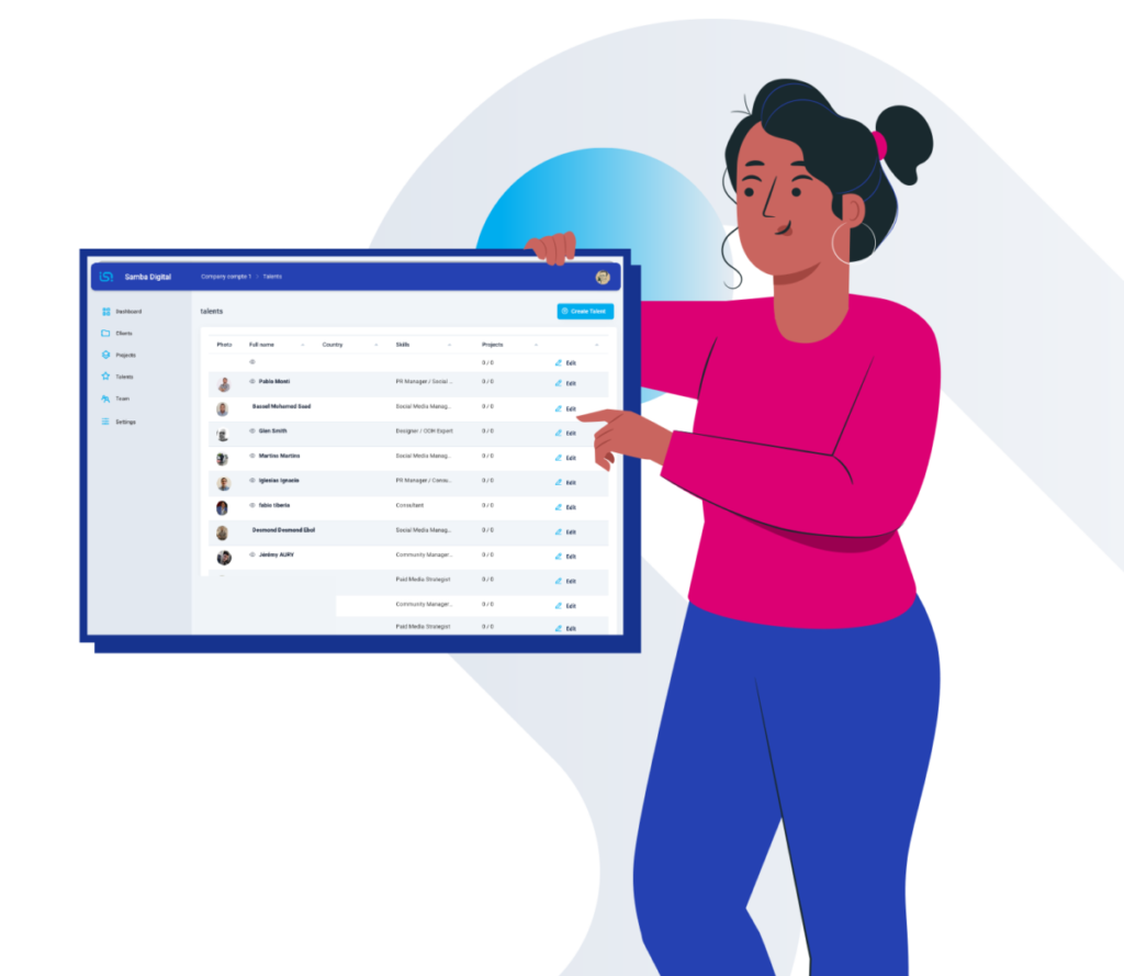 The TALENTISI platform was born from the need to change the way a marketing agency collaborates with its clients to reduce costs, gain in responsiveness, transparency, and speed to implement actions internationally. With TALENTISI, Samba Digital offers the best of a marketing and content agency combined with the agility of a platform.