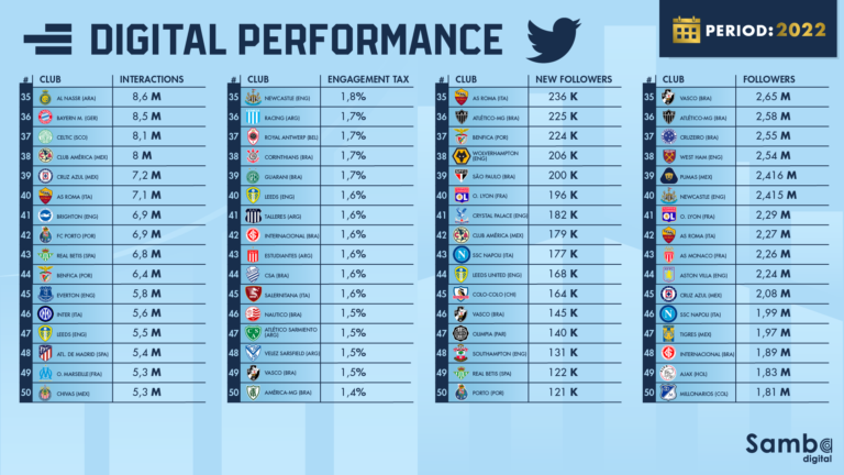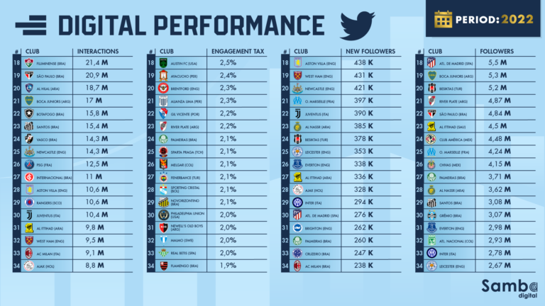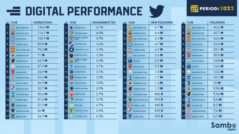 In a survey carried out by Samba Digital of some 400 profiles of clubs that compete in the world’s biggest football leagues, we found that Twitter accumulated 1.58 billion interactions throughout 2022, a performance that represents an increase of 7.4% compared to 2021 and 50% compared to 2020.