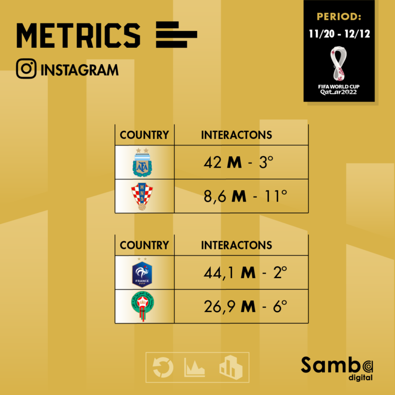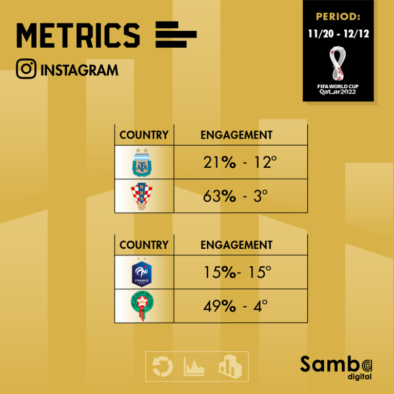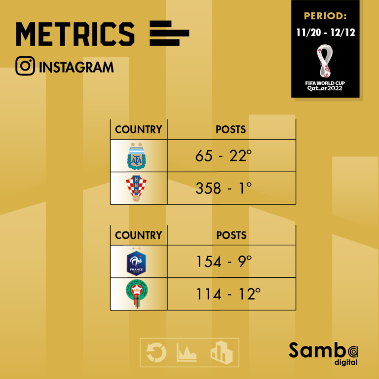 Keeping an eye on the performances of the 32 national teams on Instagram over the past 22 days, the standout remains the already-eliminated South Korea, who achieved an incredible engagement rate of 116%. Semifinalists Croatia and Morocco are also among the Top 5 most engaged profiles on Instagram.