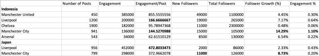 Comparing the five clubs in Japan, City, without having the advantage of a Japanese player that Arsenal do and that Liverpool did, managed to post both the second-highest engagement rate and the highest percentage of follower growth. This latter figure is arguably the most important metric for commercial purposes. Looking at City’s feed in Japan, it’s clear as well that Haaland is a firm favorite, as even Tweets announcing his scoring routine goals are more popular than those announcing results.