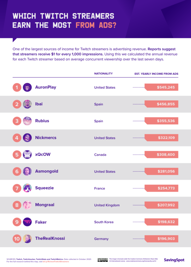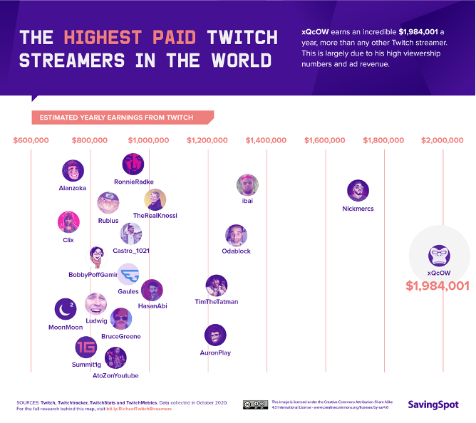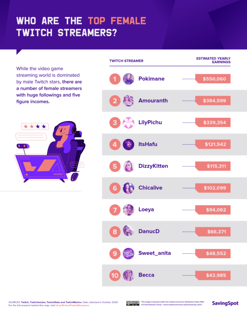 According to Twitch, last year the highest-paid streamer earned $2 million and the top 20 streamers each earned more than $1 million. Most of this revenue comes from subscriptions (80%), ads (16%) and donations (4%). The highest female streamer “Pokimane” earns around half a million dollars per year.