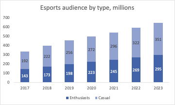 We need to understand that the difference between traditional sports and esports is the audience. Although in traditional sports we know that fans follow a specific team for example, an esports audience splits between the gaming enthusiasts and the casual viewers. Professional are those dedicated in a game or two, while casual will follow a variety of streamers. Newzoo estimates that in 2020 viewership is 495 million, and it will grow to 646 million by 2023 with 55% being casual and 45% being enthusiasts. Monetization focuses on enthusiasts mainly but it is estimated that casual viewers may unseal an extra $2 billion over the next 5 years.