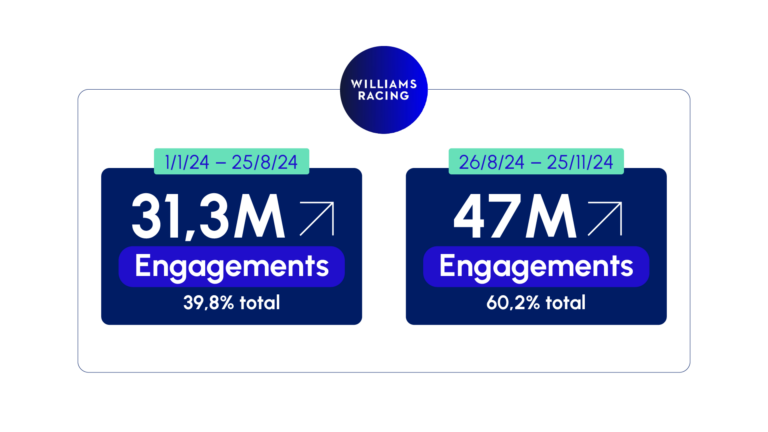 On Instagram, Williams’ performance before the Argentine driver’s arrival tells a compelling story. Over the 15 GPs prior to his debut, the team accumulated 31.3 million interactions—39.8% of their total interactions from January 1 to August 25.