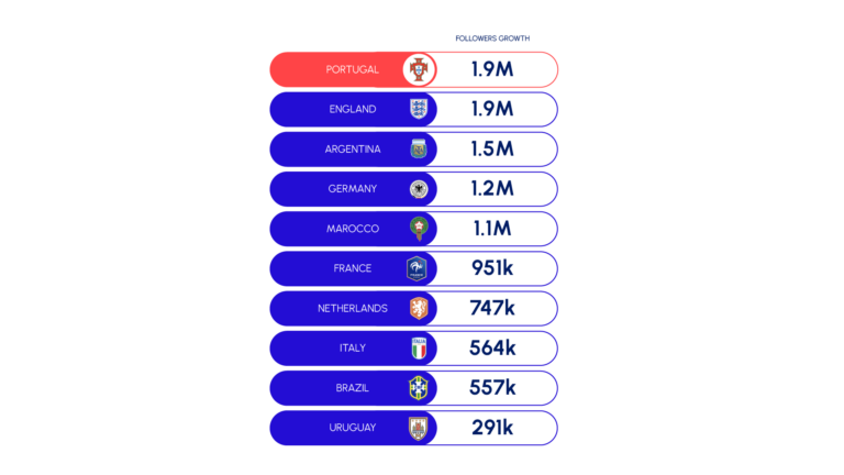 In terms of proportional growth, Portugal grew by 12%. The team with the highest proportional growth in relation to its base was Switzerland, which grew by 44% in 2024, or 115 thousand followers.