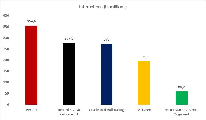 Avec 20 victoires en 21 courses – 18 par Max Verstappen et deux par Sergio Perez – Oracle Red Bull Racing a dominé la saison de Formule 1 de 2023. Cependant, cette domination sur les pistes n’est pas reproduite dans le monde digital. Avec 273 millions d’interactions sur sa page Instagram officielle en 2023, l’équipe autrichienne n’occupe que la 3e place en termes de performances numériques, derrière Scuderia Ferrari et Mercedes AMG Petronas F1 Team.
