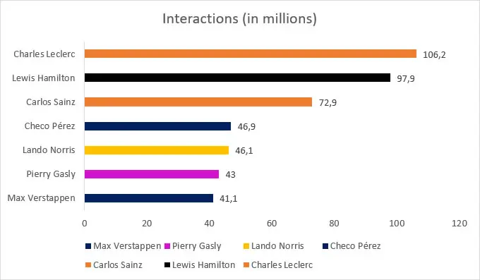 Il en va de même lorsque nous analysons digitalement le championnat du monde des pilotes. Alors que Max Verstappen a presque trois fois plus de points que le Monégasque Charles Leclerc – 2,92 fois plus de points pour être précis – dans le monde numérique, le pilote Ferrari performe 2,58 fois mieux, avec 106,2 millions d’interactions sur son compte Instagram officiel, contre 41,1 millions du Néerlandais, qui s’est même montré réticent aux innovations. Un exemple en est sa récente critique du documentaire Drive to Survive, produit par Netflix, qui présentait le « cirque de la Formule 1 » d’une manière nouvelle à un public avec des préjugés différents sur le sport.
