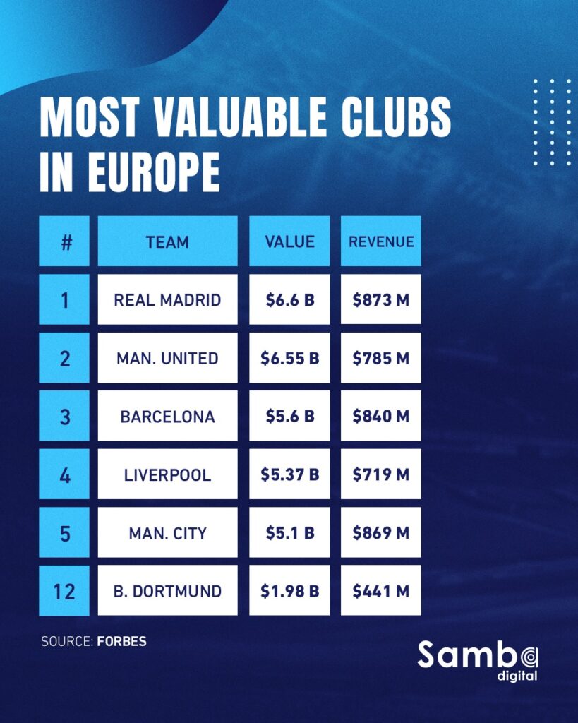 Real Madrid is the world’s most valuable club, valued at USD 66 billion by Forbes. In contrast, Borussia Dortmund is in 12th place with a valuation of around USD 198 billion. Real Madrid’s revenues are about USD 873 million, almost double that of Borussia Dortmund’s USD 441 million.