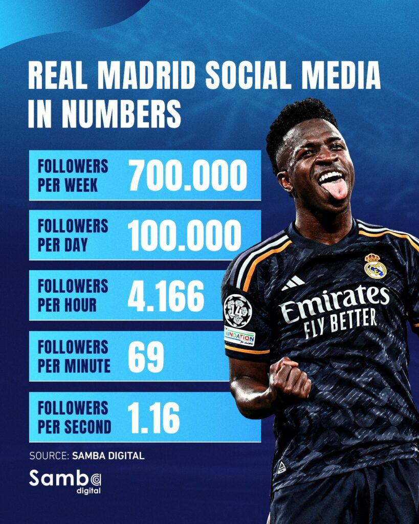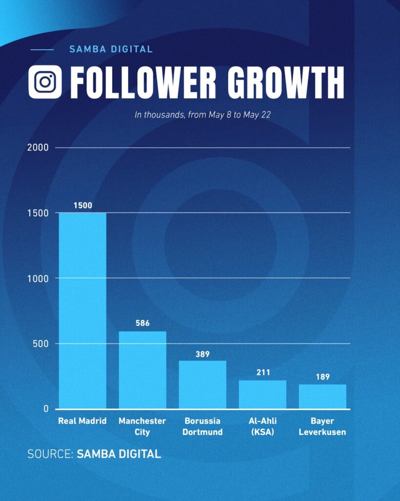 The data presented corresponds to the period between May 8 and 22. Real Madrid’s Instagram account gained almost 100,000 followers per day, equivalent to 69 per minute or 1.16 per second, totaling approximately 1.5 million new followers. No other rival comes close to this mark.