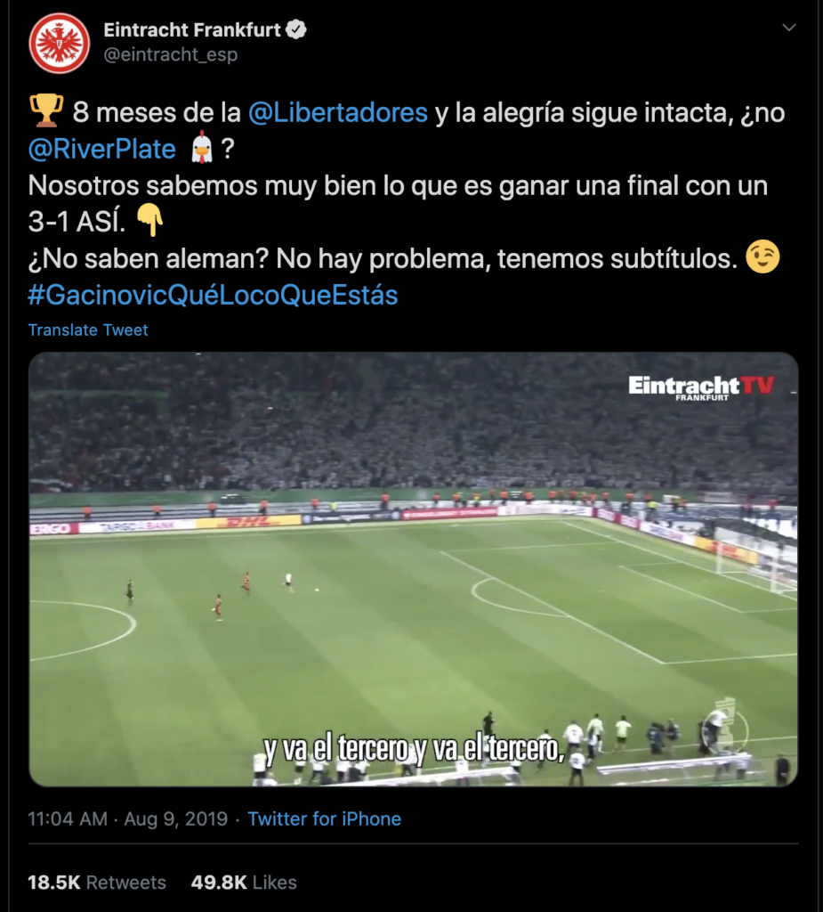 One key example was Eintracht Frankfurt’s Spanish Twitter page using a cunning tweet of a last-minute goal in a game that ended 3-1 using the tweet “Y va el tercero..” which translates to “here comes the third (goal).” The reason why that phrase has gained popularity in Argentina given that it is the same phrase was used by a commentator during the 2018 Copa Libertadores Final in which makes reference to Gonzalo “Pity” Martinez’s third and final goal to help River Plate defeat bitter rivals Boca Juniors to capture the Copa Libertadores.