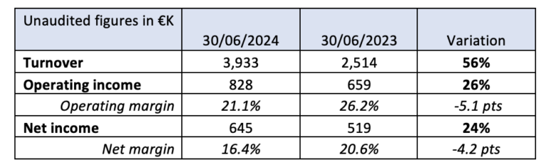 The first half of 2024 saw an increase in personnel costs related to the expansion of teams dedicated to new offerings, with a significant contribution to revenue expected from the second half of 2024. The launch of these two new commercial offerings explains the temporary decrease in operational profitability, which stands at 21.1% compared to 26.2% for the first half of 2023. However, operating profit showed sustained growth of 26% (+25% at constant exchange rates), reaching €828K. This level of profitability remains in line with the 2024 budget target of 20%.