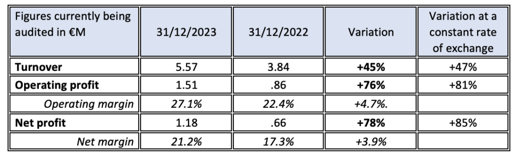 Thanks to its business model favouring recurring subscription-type revenues and the high renewal rate of its client contracts, Samba Digital starts the year with a high level of backlog. The company thus is aiming for a 2024 revenue of €10M, representing an organic growth of nearly 70% for the upcoming fiscal year.