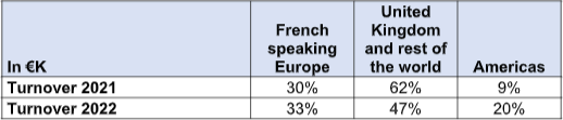 In 2022, Samba Digital continued its growth trajectory with the growth of the American market and the good orientation of activity in French-speaking Europe. The breakdown by geographical area is as follows: